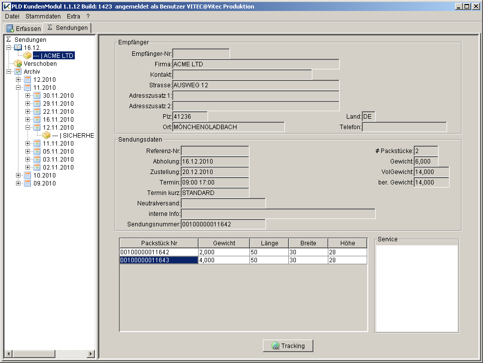 Ist zu dem Packstück eine Systemnummer hinterlegt, wird man durch den Tracking-Button auf die Tracking-Webseite weitergeleitet.Hinweis: Unter der Adresse http://www.vitec-loesung.de können die Sendungsnummern getrackt werden.